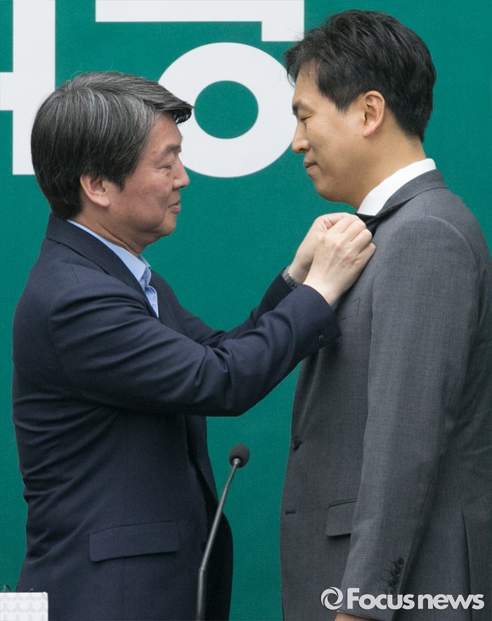 (서울=포커스뉴스) 20대 국회 임기가 시작된 30일 오전 서울 여의도 국회에서 열린 국민의당 의원총회에 참석한 안철수(왼쪽) 상임공동대표가 손금주 의원에게 의원 뱃지를 달아주고 있다.
