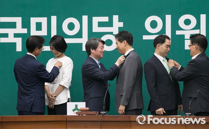 (서울=포커스뉴스) 20대 국회 임기가 시작된 30일 오전 서울 여의도 국회에서 열린 국민의당 의원총회에 참석한 안철수 상임공동대표, 천정배 공동대표, 박지원 원내대표가 초선 의원들에게 의원 뱃지를 달아주고 있다. 왼쪽부터 천정배 공동대표, 김수민 의원, 안철수 상임공동대표, 손금주, 채이배 의원, 박지원 원내대표.