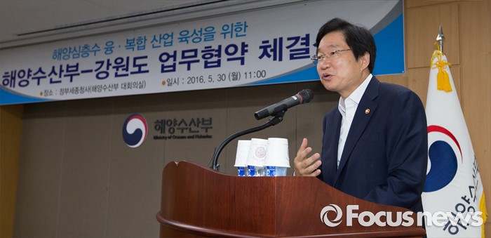 (세종=포커스뉴스) 30일 오전 세종시 정부세종청사 해양수산부 대회의실에서 열린 해양심층수 융·복합 산업 육성을 위한 해양수산부와 강원도 간 업무협약 체결식에서 김영석 해양수산부 장관이 인사말을 하고 있다.