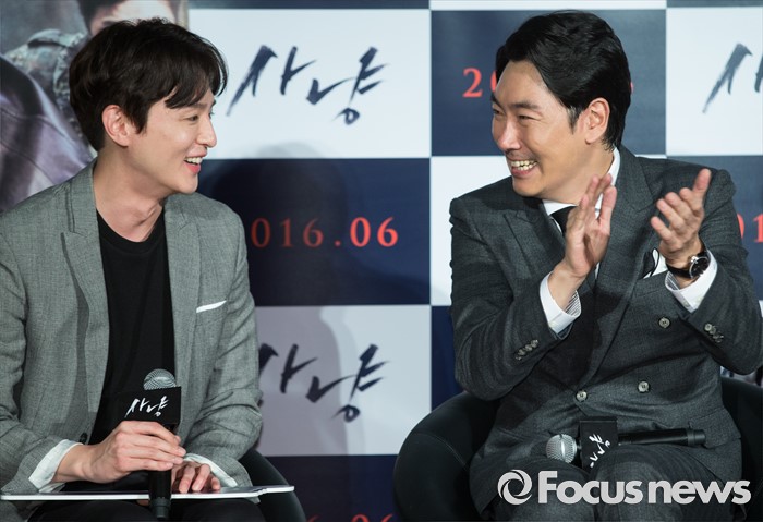 (서울=포커스뉴스) 30일 오전 서울 광진구 건대입구 롯데시네마에서 열린 영화 '사냥' 제작보고회에 참석한 배우 권율(왼쪽)과 조진웅이 미소를 짓고 있다.
