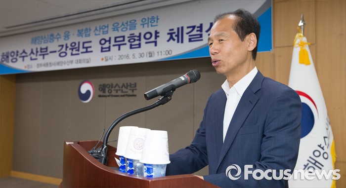 (세종=포커스뉴스) 30일 오전 세종시 정부세종청사 해양수산부 대회의실에서 열린 해양심층수 융·복합 산업 육성을 위한 해양수산부와 강원도 간 업무협약 체결식에서 최문순 강원지사가 인사말을 하고 있다.