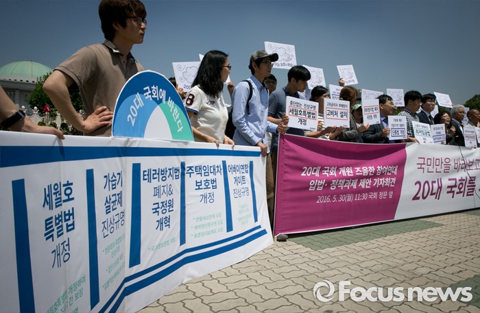 (서울=포커스뉴스) 30일 오전 서울 여의도 국회 앞에서 참여연대 등 관련단체 회원들이 20대 국회에서 우선 다뤄야 할 입법·정책과제 제안 및 국회 개혁 촉구 기자회견을 하고 있다.