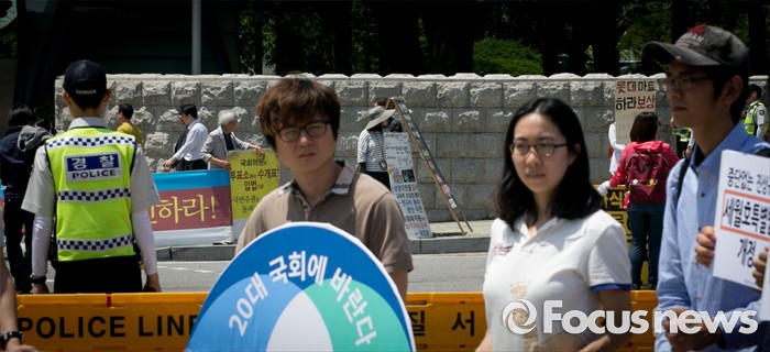 (서울=포커스뉴스) 20대 국회 임기가 시작된 30일 오전 서울 여의도 국회 앞에서 각 단체 관계자들이 1인 시위를 하고 있다.