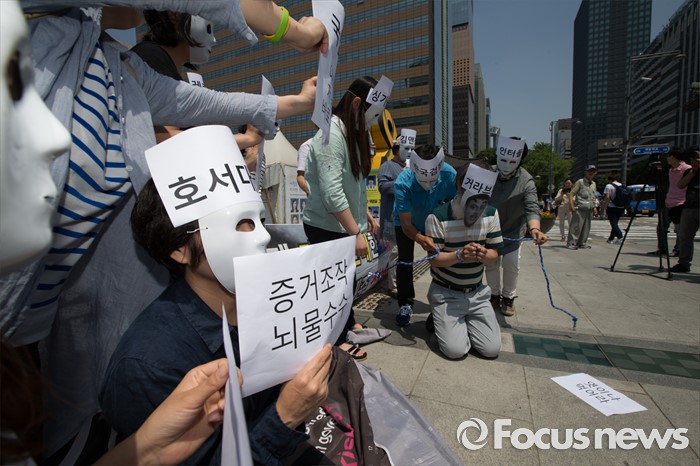 (서울=포커스뉴스) 30일 오후 서울 종로구 광화문 광장에서 환경보건시민센터 관계자들이 옥시 전 사장 검찰소환 조사 촉구하는 기자회견 및 퍼포먼스를 열고 있다.
