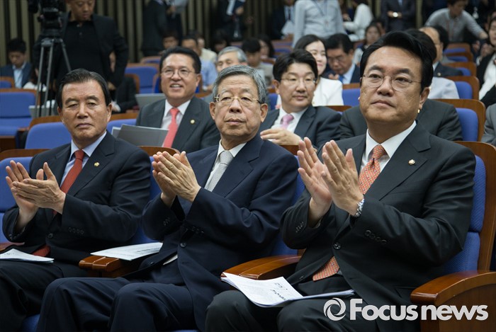 (서울=포커스뉴스) 정진석(오른쪽) 새누리당 원내대표와 김희옥(가운데) 비상대책혁신위원장 내정자가 30일 오전 서울 여의도 국회에서 열린 의원총회에 참석해 박수치고 있다.