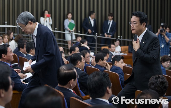 (서울=포커스뉴스) 정진석(오른쪽) 새누리당 원내대표와 김희옥 비상대책혁신위원장 내정자가 30일 오전 서울 여의도 국회에서 열린 의원총회에서 회의장을 나서고 있다.