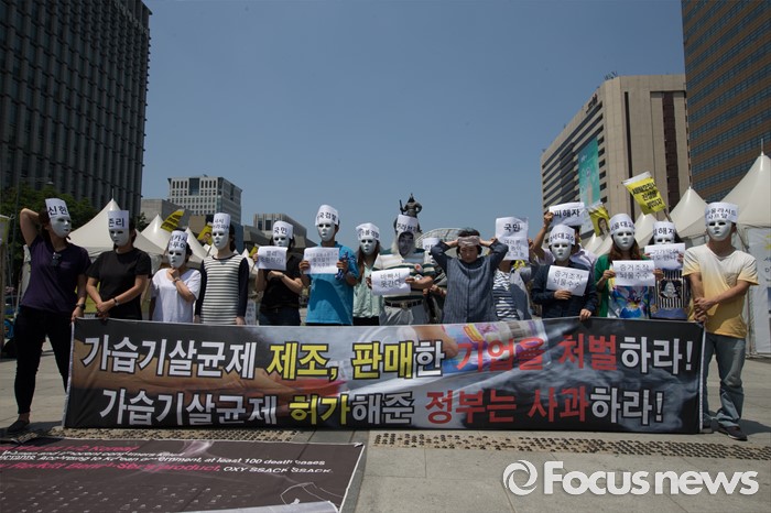 (서울=포커스뉴스) 30일 오후 서울 종로구 광화문 광장에서 환경보건시민센터 관계자들이 옥시 전 사장 검찰소환 조사 촉구하는 기자회견 및 퍼포먼스를 열고 있다.