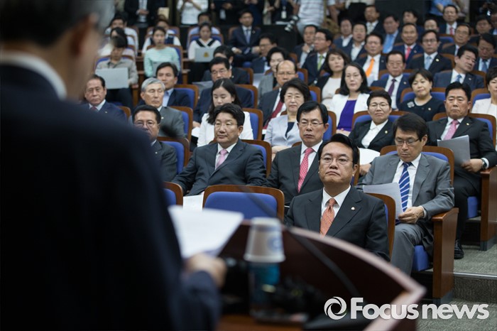 (서울=포커스뉴스) 정진석 새누리당 원내대표가 참석한 가운데 30일 오전 서울 여의도 국회에서 열린 의원총회에서 김희옥 새누리당 비상대책혁신위원장 내정자가 발언하고 있다.