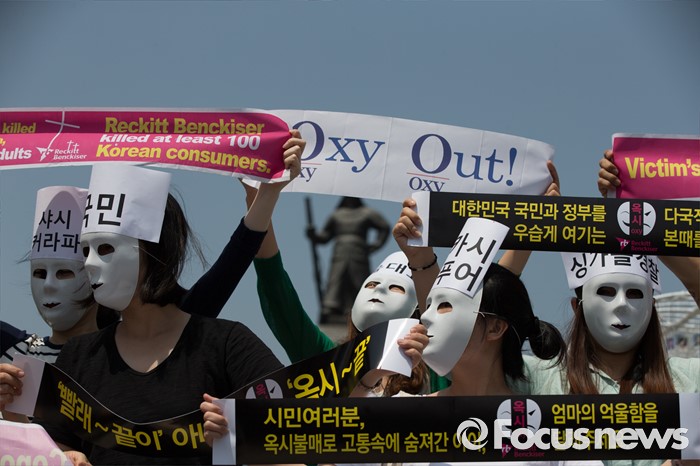 (서울=포커스뉴스) 30일 오후 서울 종로구 광화문 광장에서 환경보건시민센터 관계자들이 옥시 전 사장 검찰소환 조사 촉구하는 기자회견 및 퍼포먼스를 열고 있다.