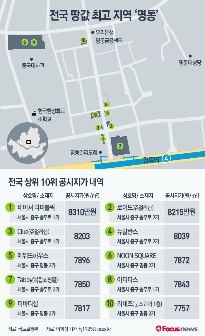 (서울=포커스뉴스) 국토교통부에 따르면 전국 252개 시·군·구 중 가장 땅값이 높은 곳은 중구 충무로1가 24-2번지 '네이처 리퍼블릭(화장품 판매점)’인 것으로 나타났다(1㎡당 8310만원). 이 밖에도 전국 공시지가 상위 10곳 모두를 서울시 중구 명동 부근 상권이 차지한 것으로 나타났다.