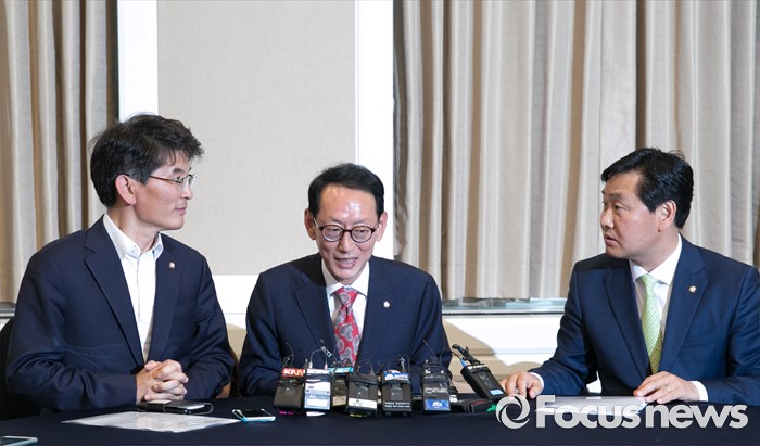 (서울=포커스뉴스) 30일 오후 서울 여의도 국회 귀빈식당에서 열린 20대 국회 원구상 협상 등을 위한 회동에 참석한 김도읍(가운데) 새누리당 원내수석부대표, 박완주(왼쪽) 더불어민주당 원내수석부대표, 김관영 국민의당 원내수석부대표가 대화하고 있다.