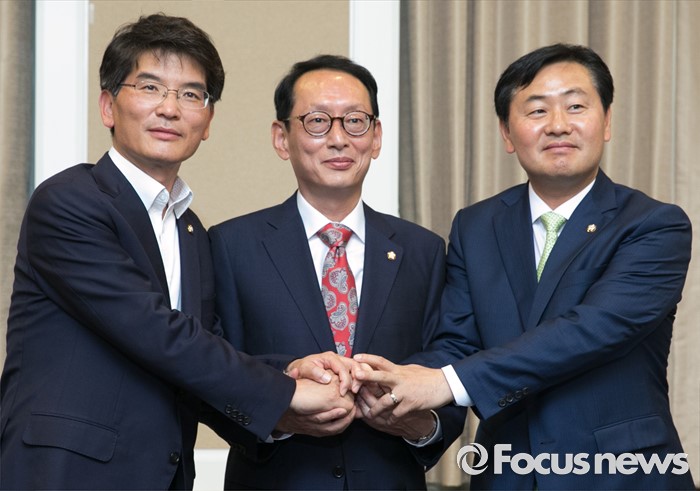 (서울=포커스뉴스) 30일 오후 서울 여의도 국회 귀빈식당에서 열린 20대 국회 원구상 협상 등을 위한 회동에 참석한 김도읍(가운데) 새누리당 원내수석부대표, 박완주(왼쪽) 더불어민주당 원내수석부대표, 김관영 국민의당 원내수석부대표가 취재진을 향해 포즈를 취하고 있다.