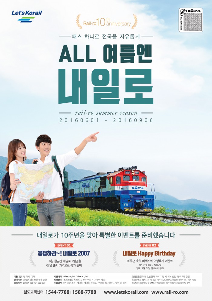 특히, 코레일은 '내일로' 탄생 10주년을 맞아 6월 한달간(여행 시작일 기준) 7일권을 10년전 최초 출시 가격인 4만9800원에 이용할 수 있는 '응답하라∼ 내일로 2007!' 이벤트 등 다양한 고객 감사행사를 진행한다.