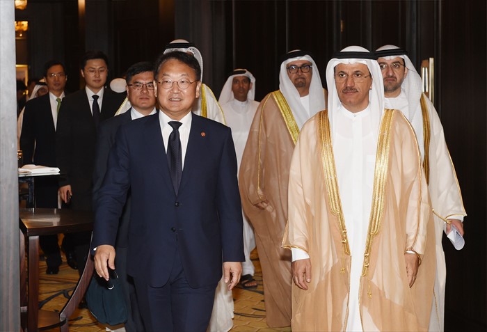 (서울=포커스뉴스) 유일호 부총리 겸 기획재정부 장관이 30일(현지시간) UAE 아부다비 St.REGIS호텔에서 열린 '제5차 한-UAE 경제공동위'에 참석, 수석대표인 알 만수리 경제부 장관과 사전면담 후 본회의장으로 입장하고 있다. <사진제공=기획재정부>