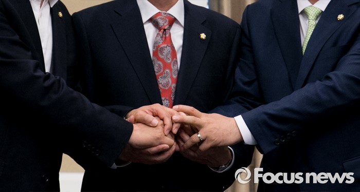 이어 "최소한의 생계를 보호받아야만 하는 절체절명의 위기에 놓인 소상공인들을 위해 우리가 할 수 있는 최선의 방법을 찾아 '제대로 된 국회', '제대로 된 의원', '제대로 된 법안'을 만드는 데 총력을 기울일 것"이라고 덧붙였다.(서울=포커스뉴스) 30일 오후 서울 여의도 국회 귀빈식당에서 열린 20대 국회 원구상 협상 등을 위한 회동에 참석한 김도읍(가운데) 새누리당 원내수석부대표, 박완주(왼쪽) 더불어민주당 원내수석부대표, 김관영 국민의당 원내수석부대표가 취재진을 향해 포즈를 취하고 있다. 2016.05.30 박동욱 기자