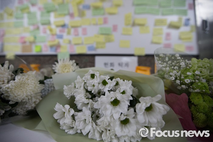 (서울=포커스뉴스) 30일 오후 서울 광진구 구의역 내에 마련된 스크린도어 사망사고 추모 장소에 고인을 추모하는 쪽지와 국화가 정리되어 있다.