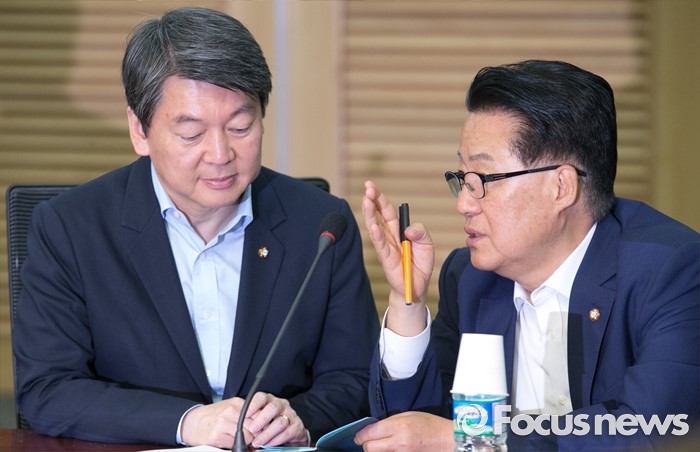(서울=포커스뉴스) 31일 오전 서울 여의도 국회 의원회관에서 열린 국민의당 8차 정책역량강화 워크숍에 참석한 안철수(왼쪽) 상임공동대표와 박지원 원내대표가 대화하고 있다.