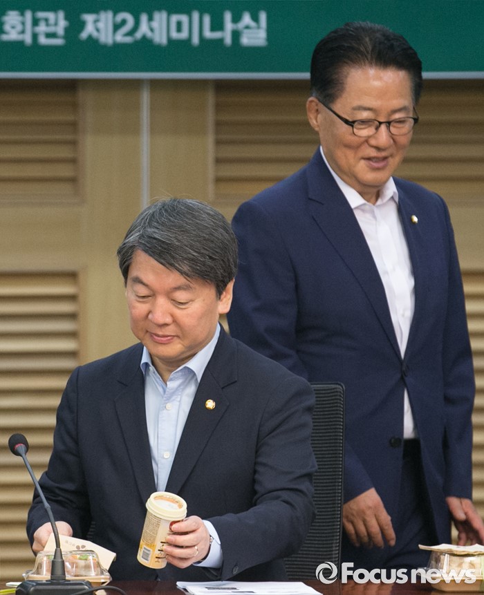 | △ 워크숍 참석하는 안철수-박지원 |