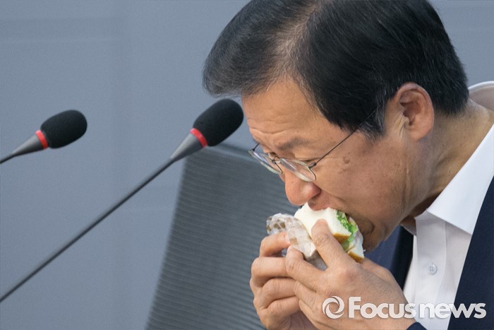 (서울=포커스뉴스) 31일 오전 서울 여의도 국회 의원회관에서 열린 국민의당 8차 정책역량강화 워크숍에 참석한 천정배 공동대표가 샌드위치를 먹고 있다.