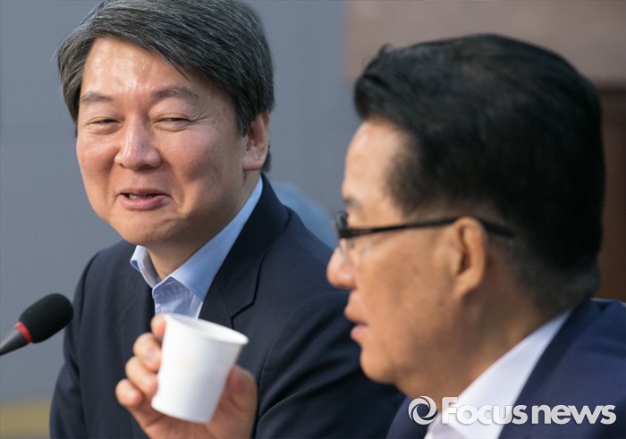 (서울=포커스뉴스) 31일 오전 서울 여의도 국회 의원회관에서 열린 국민의당 8차 정책역량강화 워크숍에 참석한 안철수(왼쪽) 상임공동대표와 박지원 원내대표가 대화하고 있다.