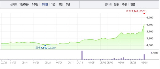 계양전기는 최근 테슬라 생산 파트너 업체에 ‘모델3’ EPB 모터를 납품하는 계약을 맺은 것으로 알려졌다.주가흐름<사진출처=네이버 캡쳐>