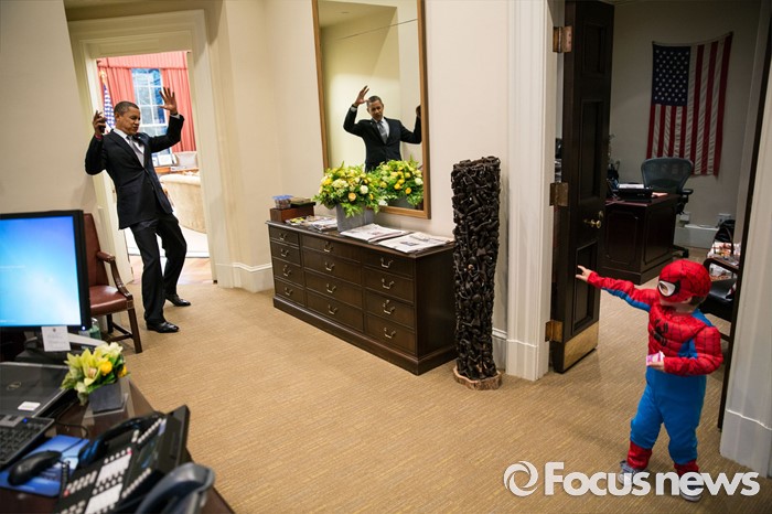 (서울=포커스뉴스) 2012년 스파이더맨 복장을 한 소년이 버락 오바마 대통령을 향해서 총을 쏘는 듯한 모습을 취하고 있으며 오바마는 두 손을 들며 항복을 표시하고 있다. 아이는 백악관에 근무하는 직원의 아들이라고 백악관은 밝혔다. <사진출처=백악관 공식홈페이지 갈무리>