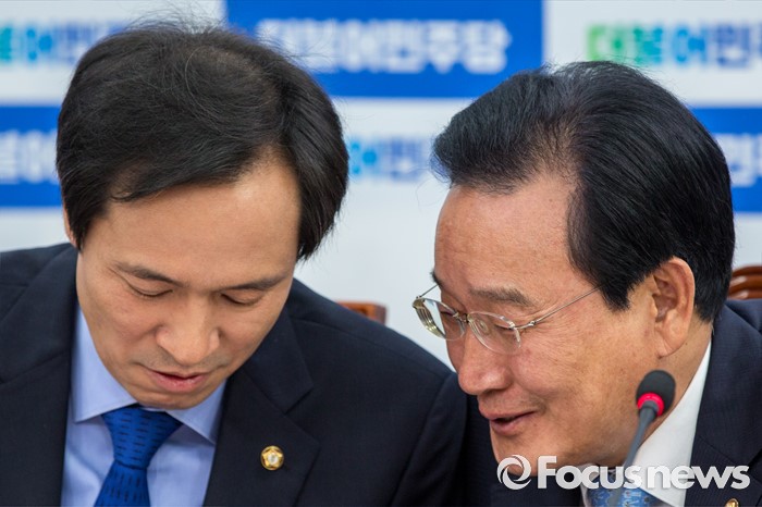 (서울=포커스뉴스) 우상호(왼쪽) 더불어민주당 원내대표와 변재일 정책위의장이 31일 오전 서울 여의도 국회에서 열린 원내대책회의에 참석해 대화를 나누고 있다.