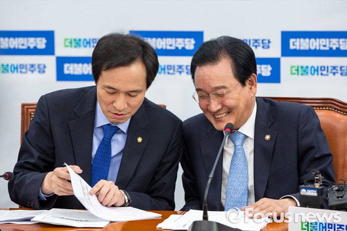 (서울=포커스뉴스) 우상호(왼쪽) 더불어민주당 원내대표와 변재일 정책위의장이 31일 오전 서울 여의도 국회에서 열린 원내대책회의에 참석해 대화를 나누고 있다.