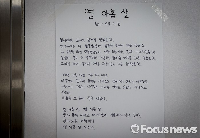 (서울=포커스뉴스) 31일 오전 서울 광진구 지하철 2호선 구의역에 스크린도어 사고로 희생된 청년을 애도하는 헌시 및 쪽지들이 붙어 있다.