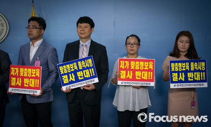 (서울=포커스뉴스) 31일 오전 서울 여의도 국회 정론관에서 한정애 더불어민주당 의원과 장진환 한국민간어린이집연합회장 등 관계자들이 어린이집 생존권 위협하는 맞춤형 보육 철회 촉구 기자회견을 하고 있다.