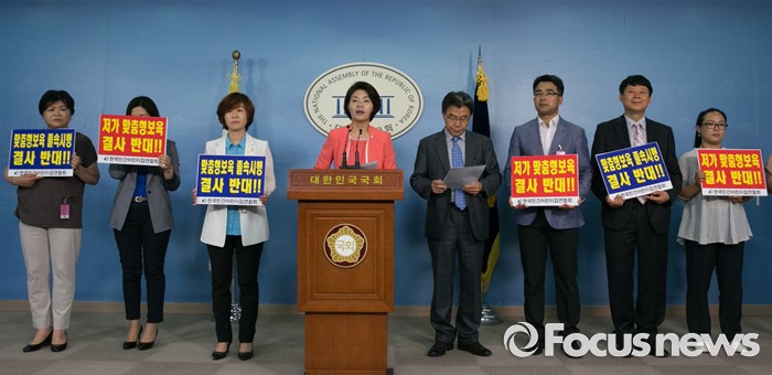 (서울=포커스뉴스) 31일 오전 서울 여의도 국회 정론관에서 한정애(왼쪽 네번째) 더불어민주당 의원과 장진환(오른쪽 네번째) 한국민간어린이집연합회장 등 관계자들이 어린이집 생존권 위협하는 맞춤형 보육 철회 촉구 기자회견을 하고 있다.