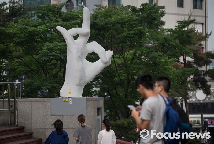 (서울=포커스뉴스) 31일 오전 서울 마포구 홍익대 정문 앞에 극우성향 사이트 '일베' 상징물 조각상이 설치되어 있다. 조각상은 일간베스트저장소를 상징하는 자음 'ㅇ'과 'ㅂ' 모양을 하며 회원을 인증하는 손 모양이다. 이 조각상은 조소과 4학년 홍기하씨가 '환경조각연구' 수업 과제로 제작되어 '환경조각연구 야외조각전에 출품한 것으로 '어디에나 있고, 아무데도 없다'는 제목을 붙였다.