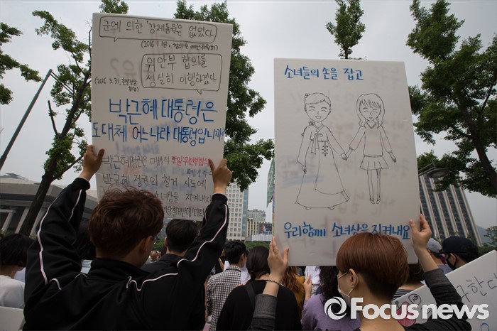 (서울=포커스뉴스) 한일 일본군위안부 합의 무효를 위한 대학생 대책위원회 학생들이 31일 오전 서울 종로구 대한민국역사박물관 앞에서 일본군위안부 피해자 의견 배제한 재단설립 강행 규탄 기자회견을 열고 있다.