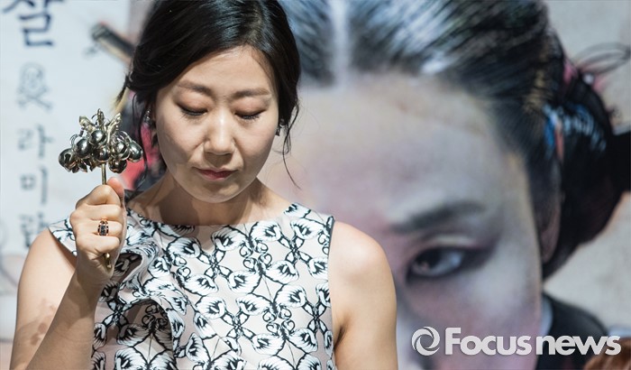 (서울=포커스뉴스) 31일 오전 서울 강남구 압구정CGV에서 열린 영화 '봉이 김선달' 제작보고회에극중 무속인 역할을 맡은 배우 라미란이 방울을 흔들고 있다.