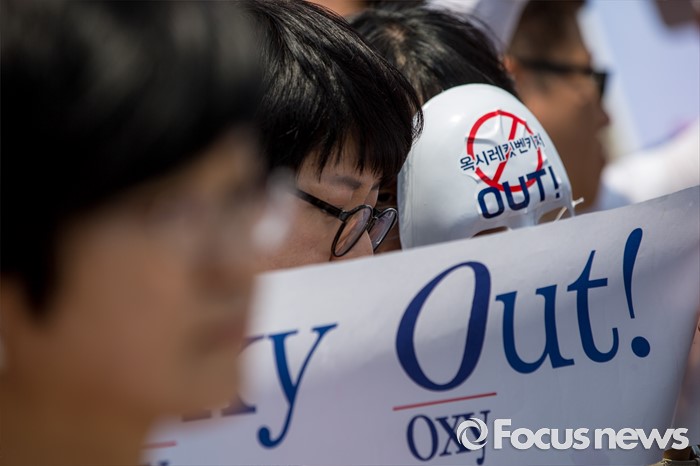 (서울=포커스뉴스) 31일 오후 서울 여의도 국회 앞에서 경제정의실천시민연합 관계자들이 옥시 제품 불매 및 옥시 예방법 제정을 촉구하는 기자회견을 하고 있다.
