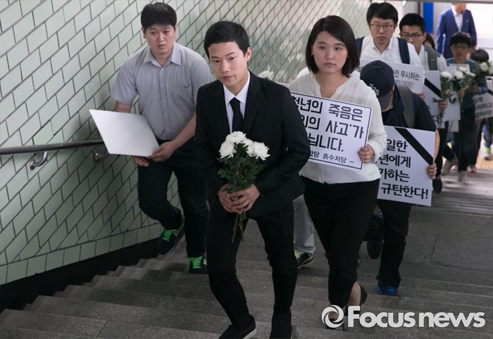(서울=포커스뉴스) 31일 오후 서울 광진구 지하철 구의역에서 스크린도어 정비 작업 중 사고로 숨진 김모(19) 씨 사건 항의 기자회견을 마친 김 씨의 친구와 한국청년연대 등 청년단체들이 고인을 추모하기 위해 사건장소로 향하고 있다.