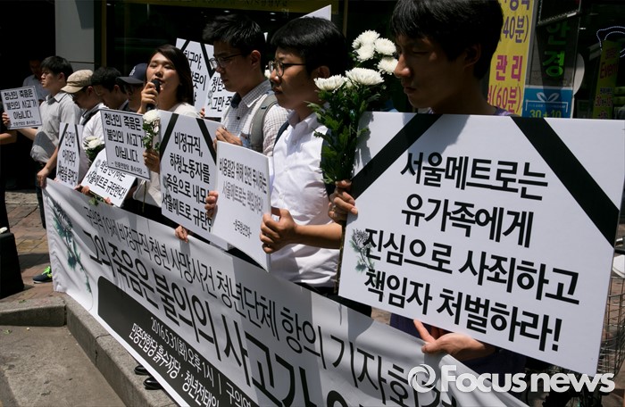 (서울=포커스뉴스) 31일 오후 서울 광진구 지하철 구의역 앞에서 한국청년연대 등 청년단체들이 스크린도어 정비 작업 중 사고로 숨진 김모(19) 씨 사건 항의 기자회견을 하고 있다.