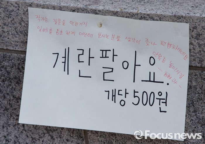 (서울=포커스뉴스) 31일 오후 서울 마포구 홍익대학교 정문에 설치된 극우성향 사이트 '일베' 상징물 조각상 아래 '계란팔아요'가 적힌 종이 위로 작가의 중립성을 옹호하는 문장이 적혀 있다. 조각상은 일간베스트저장소를 상징하는 자음 'ㅇ'과 'ㅂ' 모양을 하며 회원을 인증하는 손 모양이다. '어디에나 있고, 아무데도 없다'는 제목의 이 조각상은 조소과 4학년 홍기하씨가 '환경조각연구' 수업 과제로 제작해 야외조각전에 출품한 것이다.