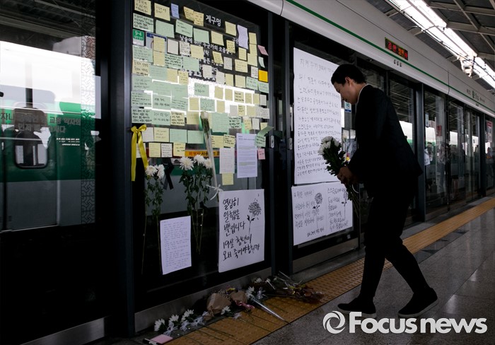 (서울=포커스뉴스) 31일 오후 서울 광진구 지하철 구의역에서 스크린도어 정비 작업 중 사고로 숨진 김모(19) 씨 사건 항의 기자회견을 마친 김 씨의 친구와 한국청년연대 등 청년단체들이 사건장소를 찾아 고인을 추모하고 있다.
