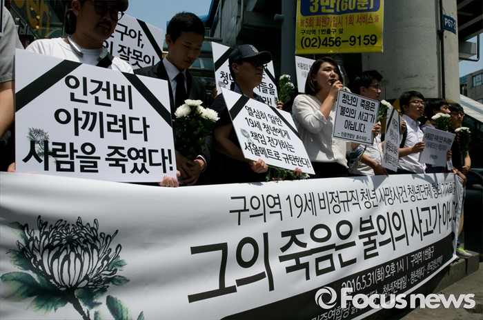 (서울=포커스뉴스) 31일 오후 서울 광진구 지하철 구의역 앞에서 한국청년연대 등 청년단체들이 스크린도어 정비 작업 중 사고로 숨진 김모(19) 씨 사건 항의 기자회견을 하고 있다.