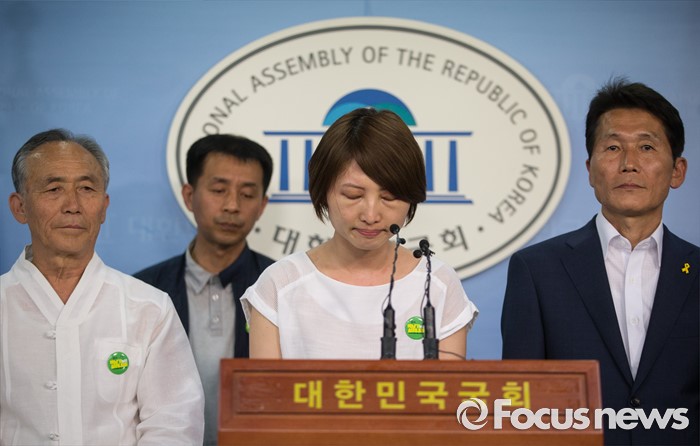 (서울=포커스뉴스) 31일 오후 서울 여의도 국회에서 열린 야3당과 백남기 대책위 공동 기자회견에 참석한 백남기씨의 딸 백도라지씨가 진상조사와 책임자 처벌, 재발 방지를 위한 국회 청문회 실시를 촉구하며 슬픔에 잠겨 있다. 이날은 경찰의 물대포 진압으로 지난해 11월14일 민중총궐기에서 쓰러진 백남기 농민이 사경을 헤맨 지 200일째되는 날이다.