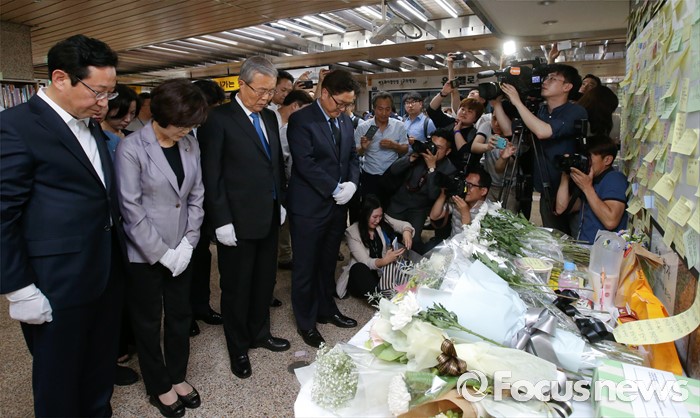 (서울=포커스뉴스) 김종인 더불어민주당 비대위 대표와 을지로위원회 소속 의원들이 31일 오후 서울 광진구 지하철 구의역 역사 내에 마련된 스크린도어 정비 작업 중 사고로 숨진 김모(19) 씨의 추모공간을 방문해 묵념을 하고 있다.