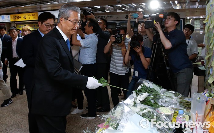 | △ 구의역 추모공간 방문해 헌화하는 김종인 |