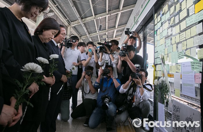 (서울=포커스뉴스) 심상정 정의당 상임대표와 노회찬 원내대표 등 의원들이 31일 오후 서울 광진구 지하철 구의역에서 스크린도어 정비 작업 중 사고로 숨진 김모(19) 씨의 사건장소를 방문해 고인을 추모하고 있다.