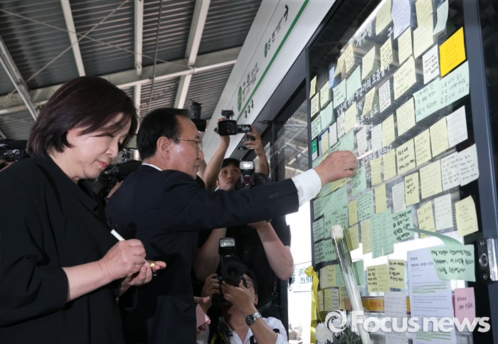 (서울=포커스뉴스) 심상정(왼쪽) 정의당 상임대표와 노회찬 원내대표 등 의원들이 31일 오후 서울 광진구 지하철 구의역에서 스크린도어 정비 작업 중 사고로 숨진 김모(19) 씨의 사건장소를 방문해 고인을 추모하는 메모를 작성한 뒤 붙이고 있다.