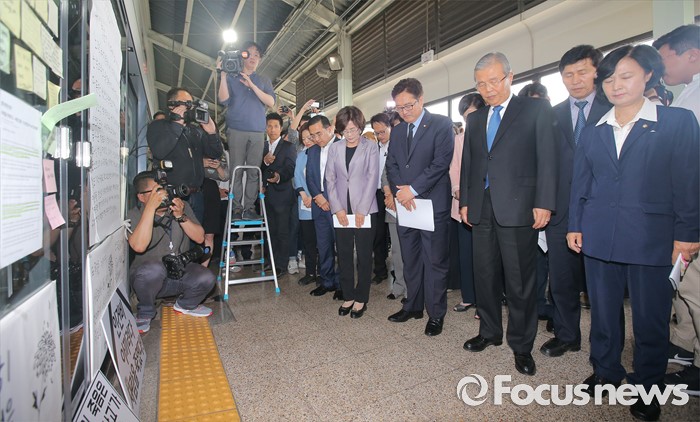 (서울=포커스뉴스) 김종인 더불어민주당 비대위 대표와 을지로위원회 소속 의원들이 31일 오후 서울 광진구 지하철 구의역에서 스크린도어 정비 작업 중 사고로 숨진 김모(19) 씨의 사건장소를 방문해 고인을 추모하고 있다.