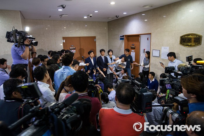 (서울=포커스뉴스) 야3당 원내수석부대표들이 31일 오후 서울 여의도 국회에서 가습기 살균제 사건, 세월호특별법 제정, 어버이연합 게이트 등 현안 공조 관련 브리핑을 마친 뒤 기자회견장을 나서고 있다. 왼쪽부터 김관영 국민의당 원내수석부대표, 박완주 더불어민주당 원내수석 부대표, 이정미 정의당 원내수석부대표.