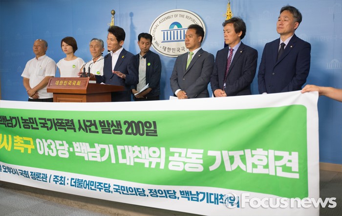(서울=포커스뉴스) 31일 오후 서울 여의도 국회 정론관에서 야 3당 의원들과 백남기 대책위 회원들이 백남기 농민 사건 발생 200일째를 맞아 국회 청문회 실시를 촉구하는 공동 기자회견을 하고 있다.