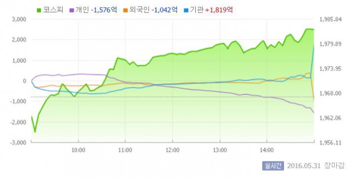 이날 코스피는 약보합세로 거래를 시작했으나, 개인의 사자에 상승세로 방향을 바꿨다. 이후 지수는 기관의 강한 매수세에 힘입어 결국 1980선을 넘어섰다. 기관은 이날 1823억원 가량의 주식을 사들이며 주가 상승을 주도했다.