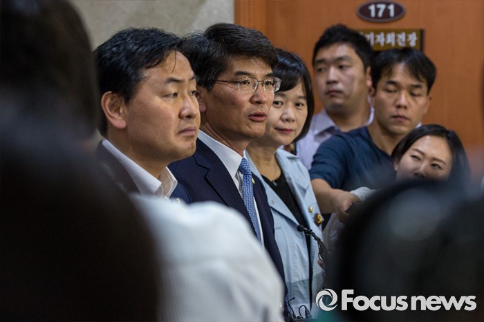 (서울=포커스뉴스) 야3당 원내수석부대표들이 31일 오후 서울 여의도 국회에서 가습기 살균제 사건, 세월호특별법 제정, 어버이연합 게이트 등 현안 공조 관련 브리핑을 마친 뒤 기자회견장을 나서고 있다. 왼쪽부터 김관영 국민의당 원내수석부대표, 박완주 더불어민주당 원내수석 부대표, 이정미 정의당 원내수석부대표.